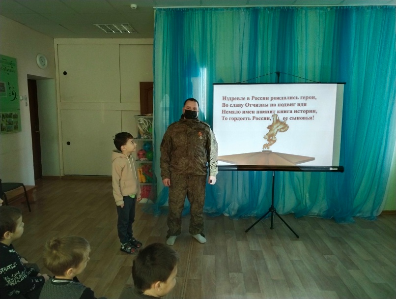 Выступая перед дошкольниками, военнослужащий отметил, что Россия всегда славилась своими героями, которые, не задумываясь, вставали на защиту своей Родины и ее интересов.
